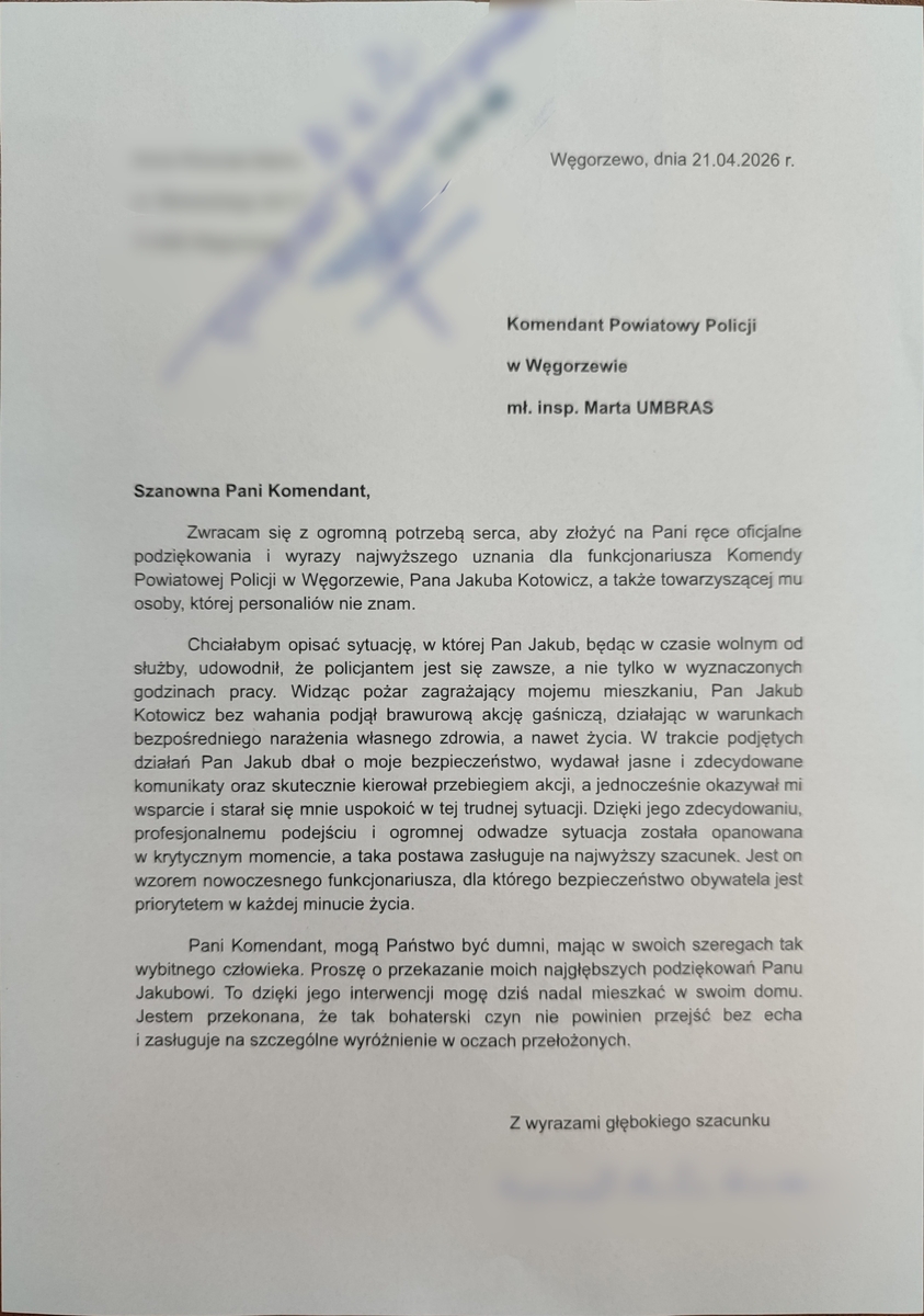Wdzięczna za okazaną pomoc kobieta skierowała pisemne podziękowania do Komendanta Powiatowego Policji w Węgorzewie, podkreślając profesjonalizm i zaangażowanie sierżanta Kotowicza.